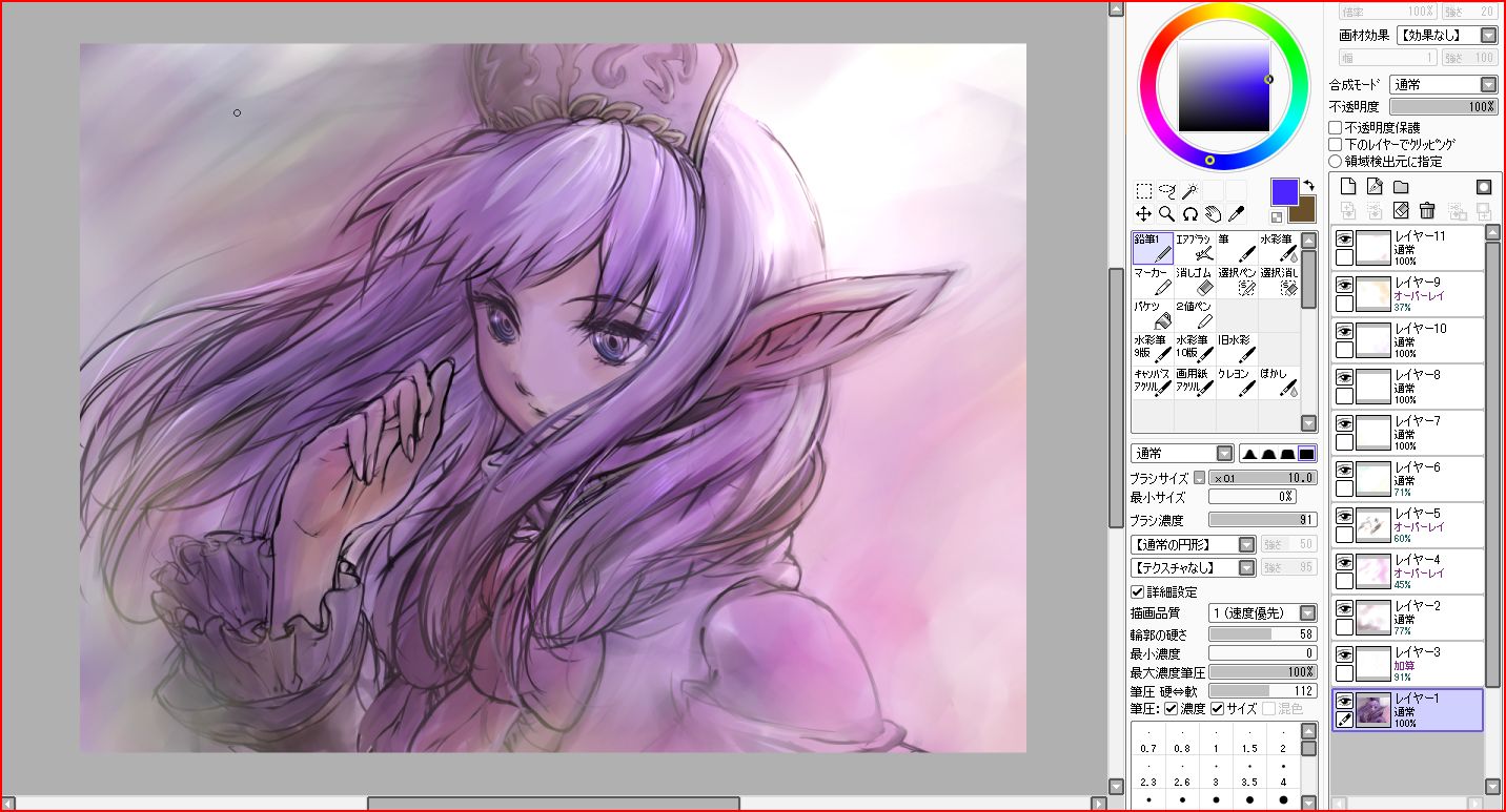 線画に乗算で色塗りして重ねて上に加算、覆い焼きで光調整して